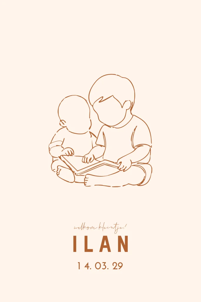 Een liefdevol geboortekaartje voor een jongen met een subtiele lijntekening van een broer die voorleest aan de baby. Het ontwerp heeft een zachte uitstraling en kun je eenvoudig zelf aanpassen in onze online editor. (24804)