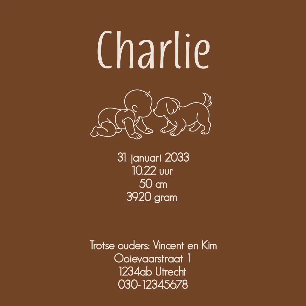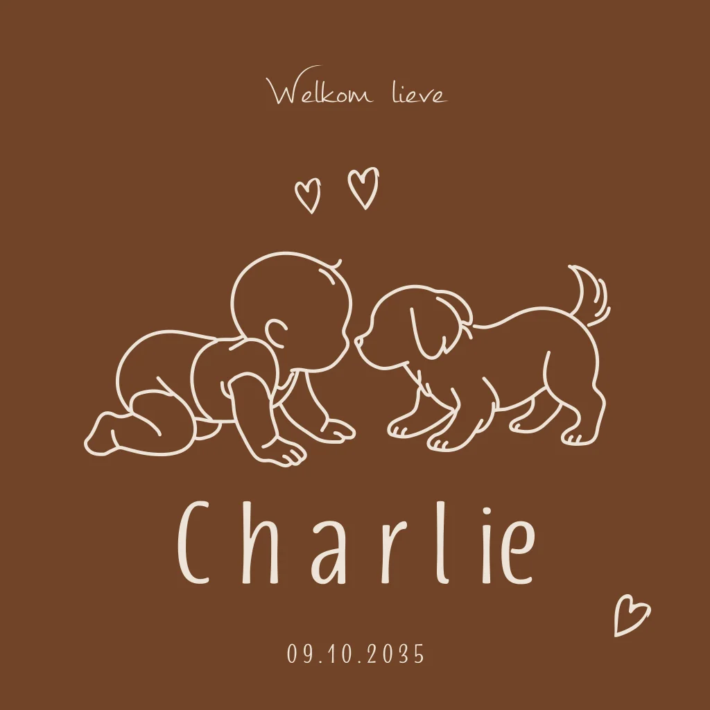 Een schattig getekend geboortekaartje met baby en een kleine hond in warm rood. Dit kan gebruikt worden voor jongens en meisjes. Personaliseer het ontwerp in onze online editor (30400)