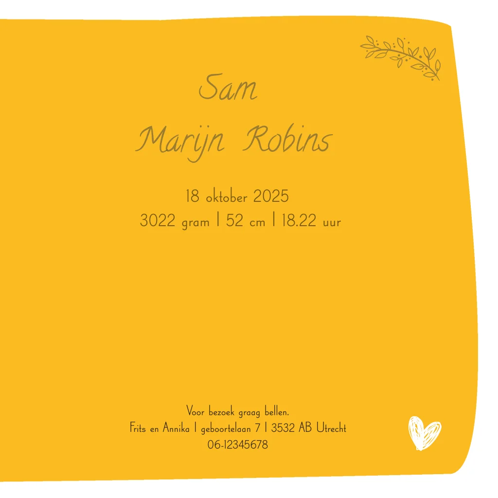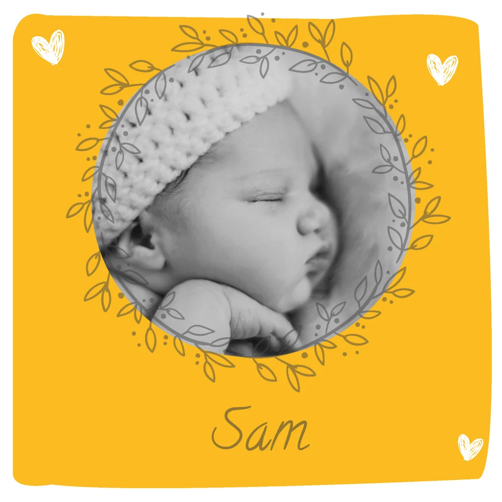Jongens Foto geboortekaartje met handgetekende krans en hartjes. In okergeel, met mogelijkheid om een foto te plaatsen achter het ronde kader. (7562)