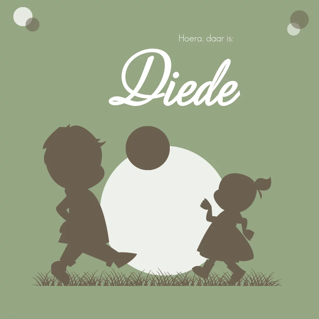 Stoer geboortekaartje 2e kindje voor een meisje met een silhouette van een grote broer en klein zusje die aan het voetballen zijn. 2e kindje. (21056)