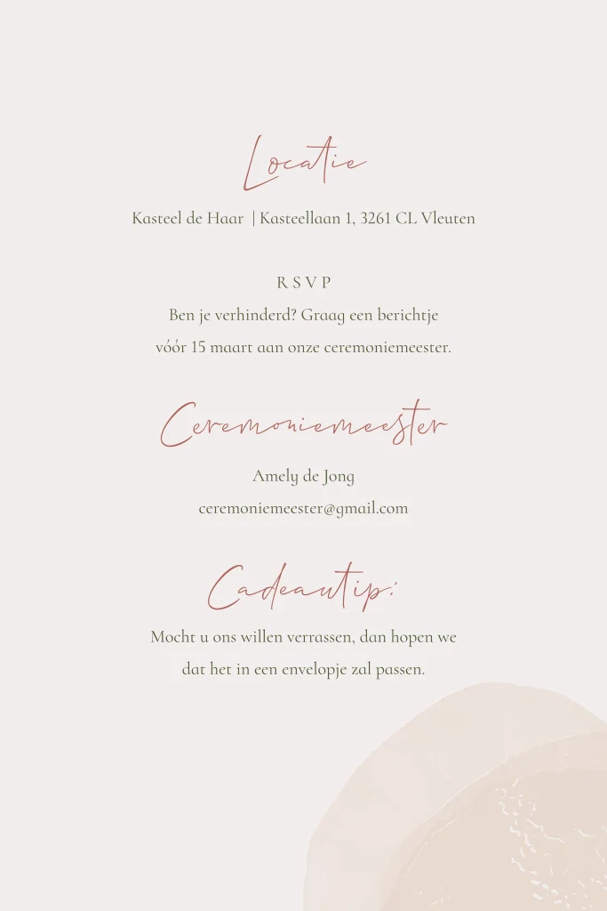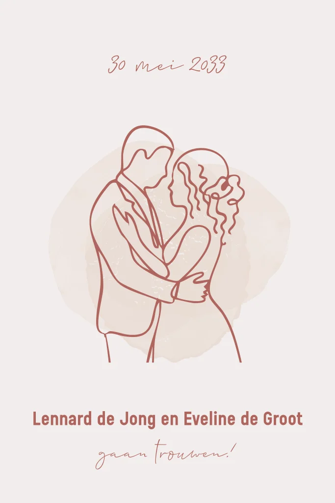 Trouwkaart met een lijntekening van een bruidspaar in mooie warme aardetinten met oud roze terra. (30165) Willen jullie de tekening aangepast hebben zodat het meer op jullie lijkt? Vaak is dat mogelijk, neem daarvoor contact met ons op.