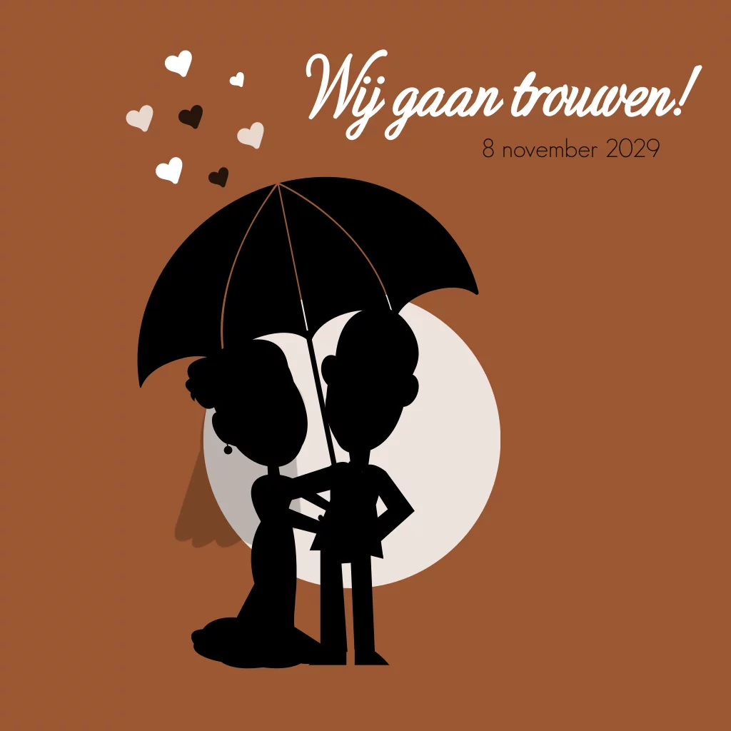 Leuke herfst thema trouwkaart met een silhouet van een bruidspaar met een paraplu en hartjes regen, leuk voor een bruidspaar dat deze herfst trouwt. (21230)