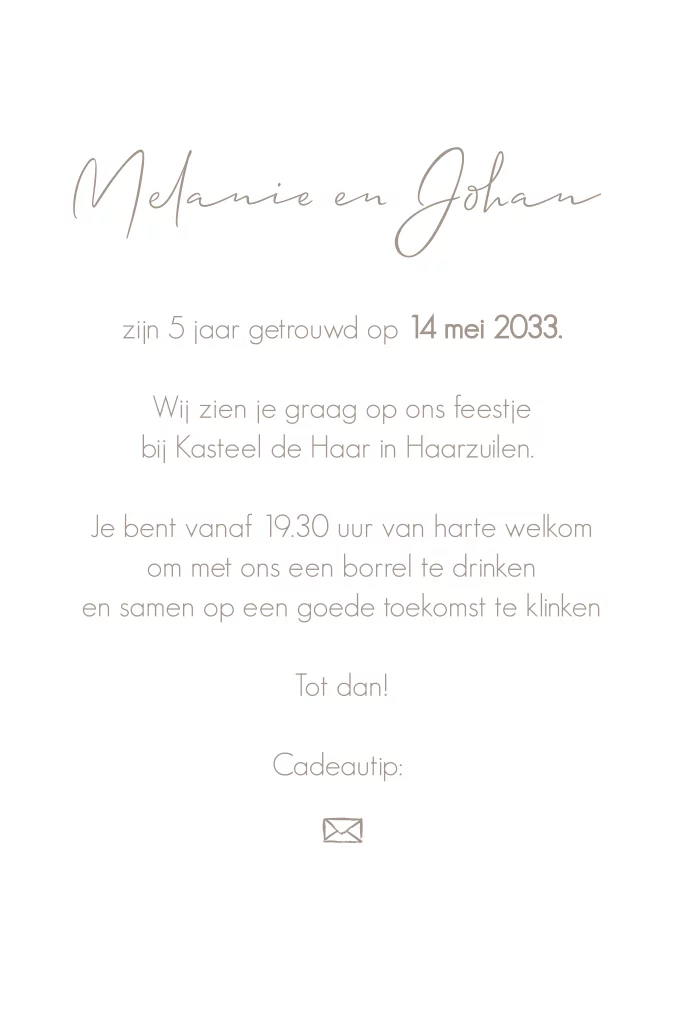 Moderne uitnodiging jubileum 5 jaar getrouwd met een fotokader in de vorm van een boog. In een warm taupe kleur. (30110)