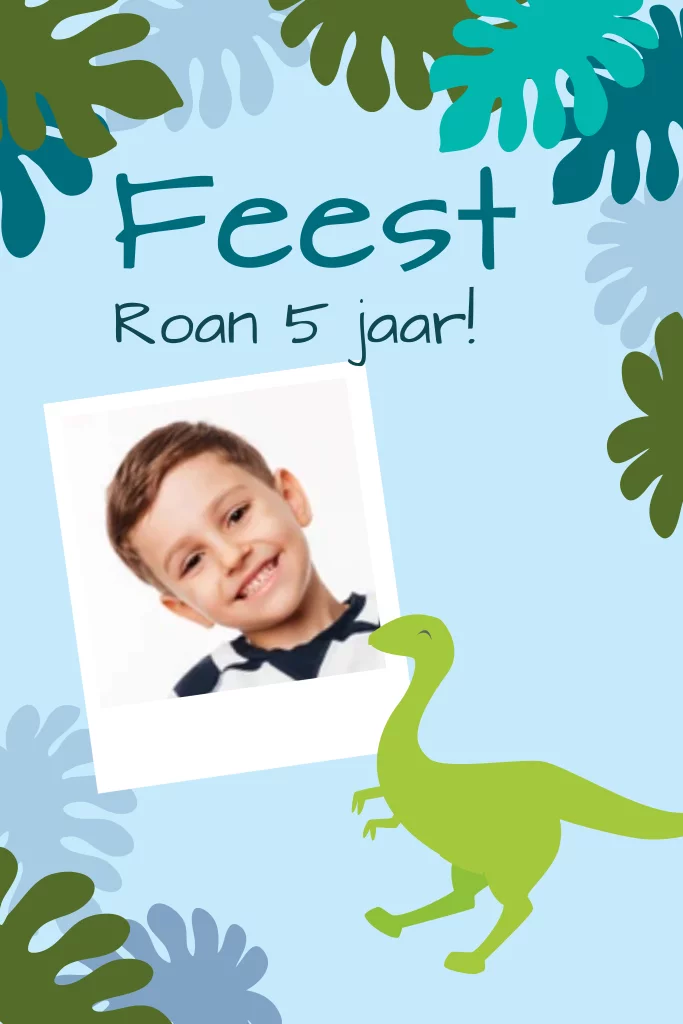 Uitnodiging voor een stoer dinosaurus feestje met een getekende dinosaurus en ruimte voor een foto. (22736)