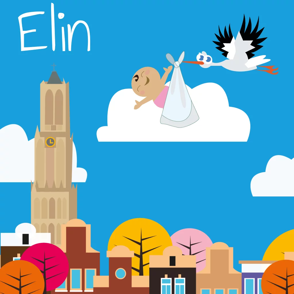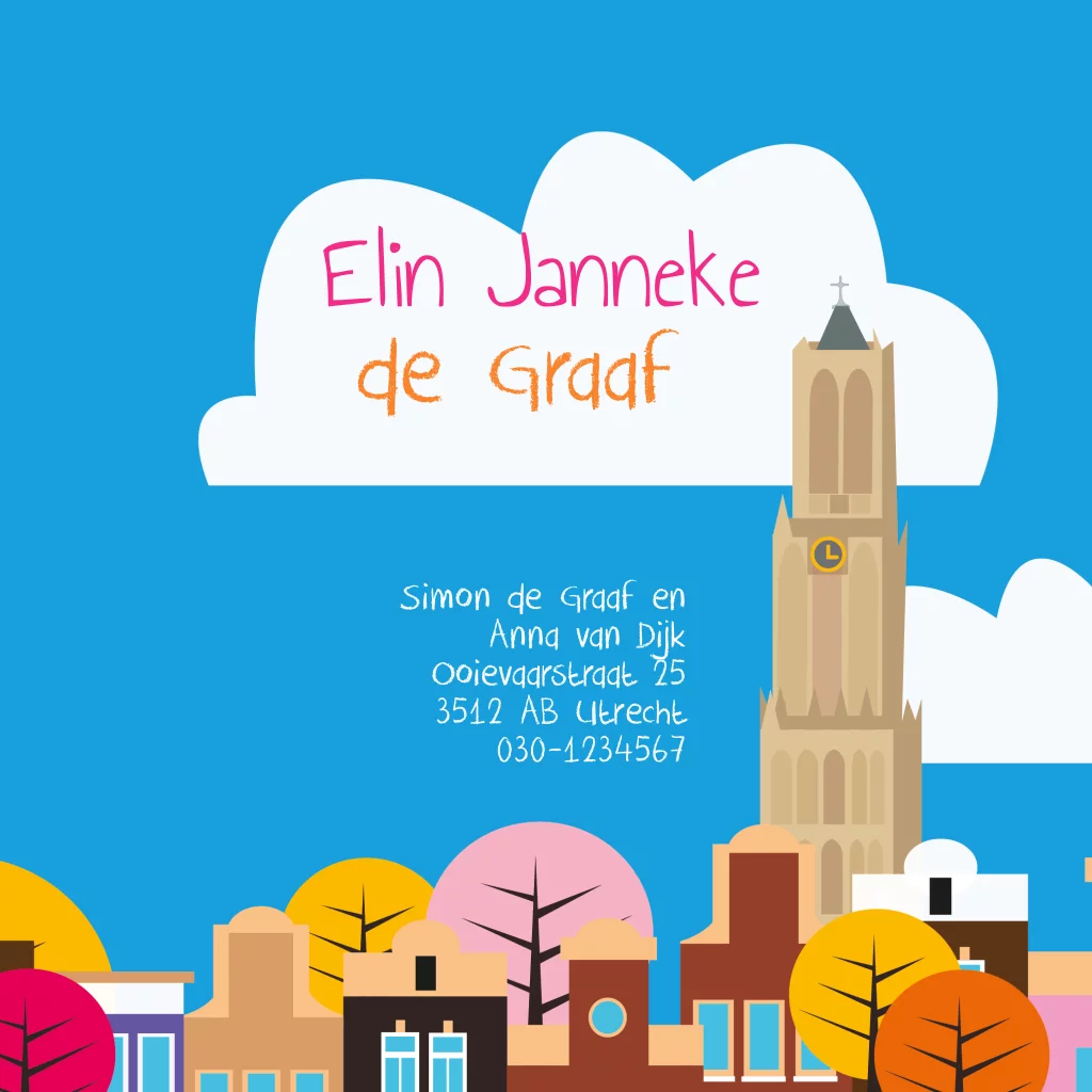 Vrolijk geboortekaartje ooievaar voor een meisje dat in de herfst in Utrecht verwacht wordt. Met een ooievaar die over grachten en de Domtoren heenvliegt. (3752)