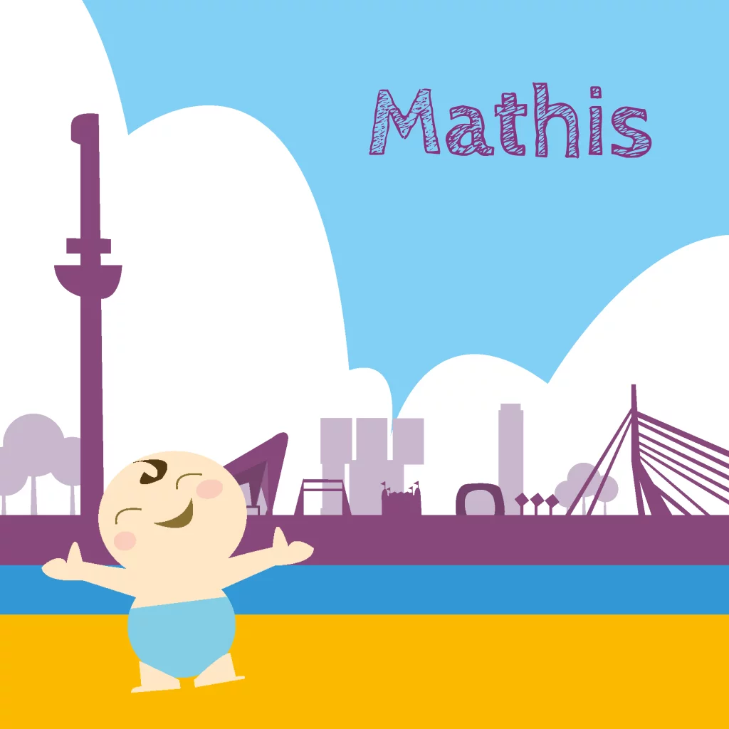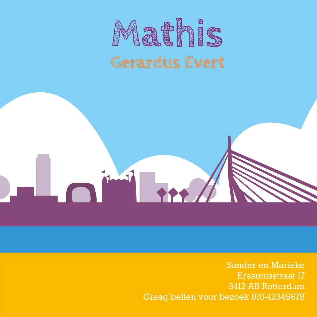 Vrolijk getekend geboortekaartje rotterdam met baby en erasmusbrug