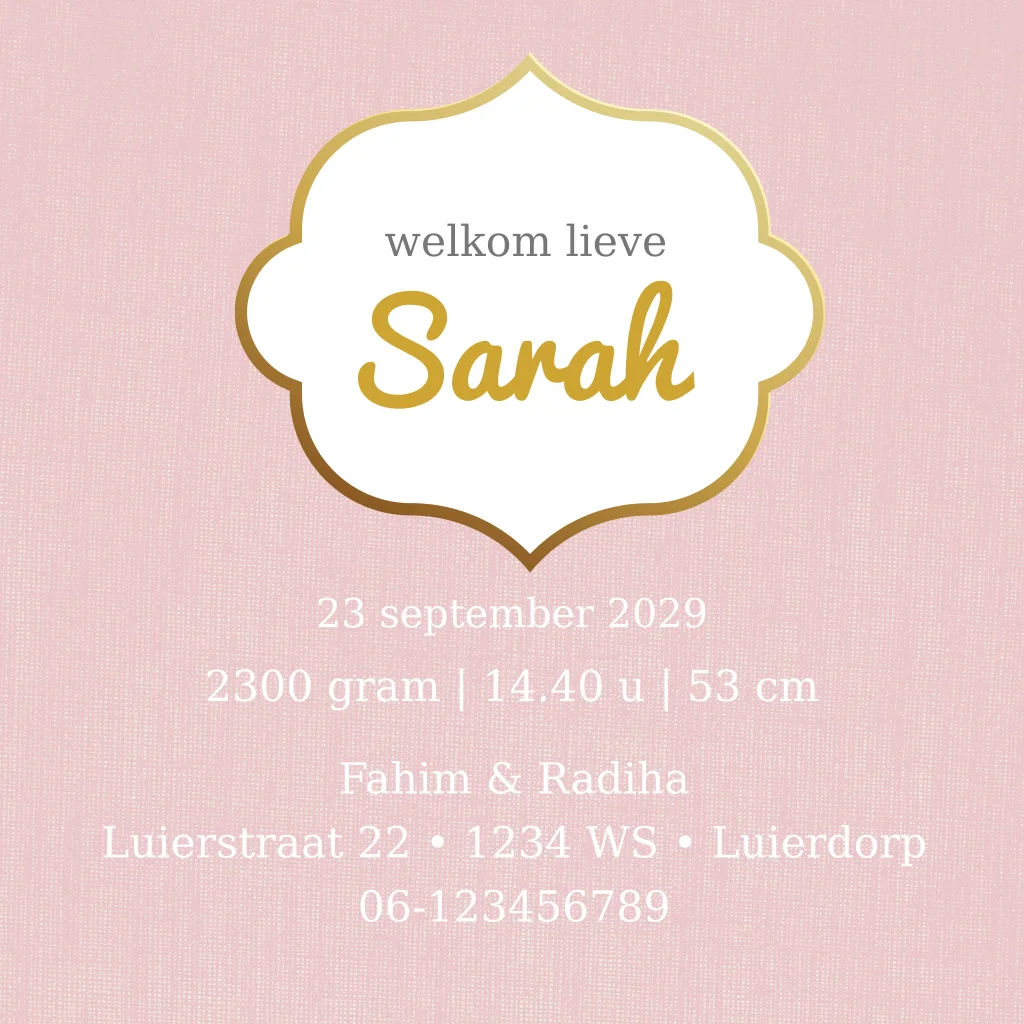 Maak dit mooie geboortekaartje voor jullie wondertje! Met mooi patroon in de achtergrond en leuke goudkleurige strik.