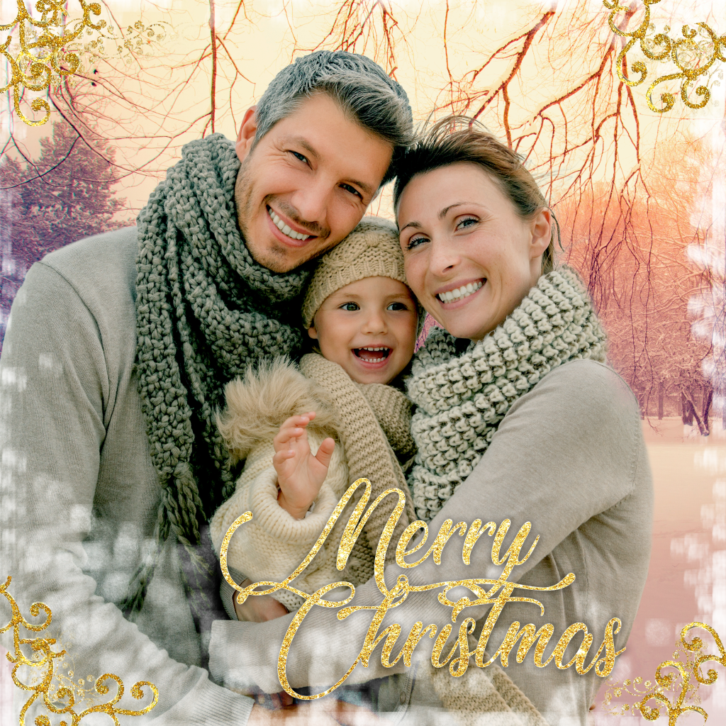 Maak deze feestelijke foto kerstkaart met goud-look krullen en sneeuwvlokken. (8043)