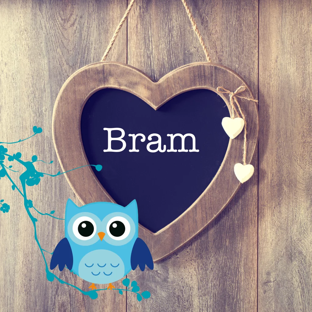 Geboortekaartje met schattig uiltje. De naam van jullie zoon mooi op een krijtbord hartje met houten planken. (5884)