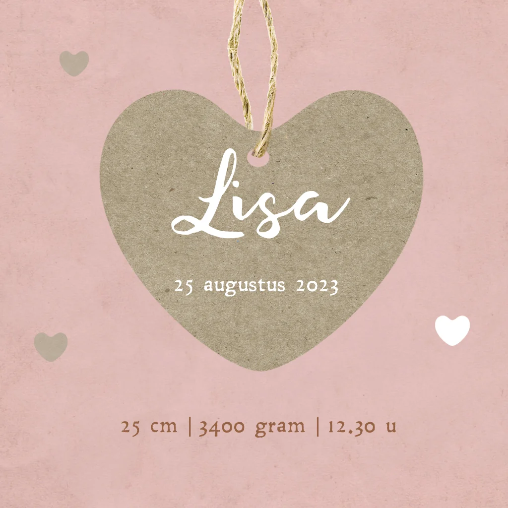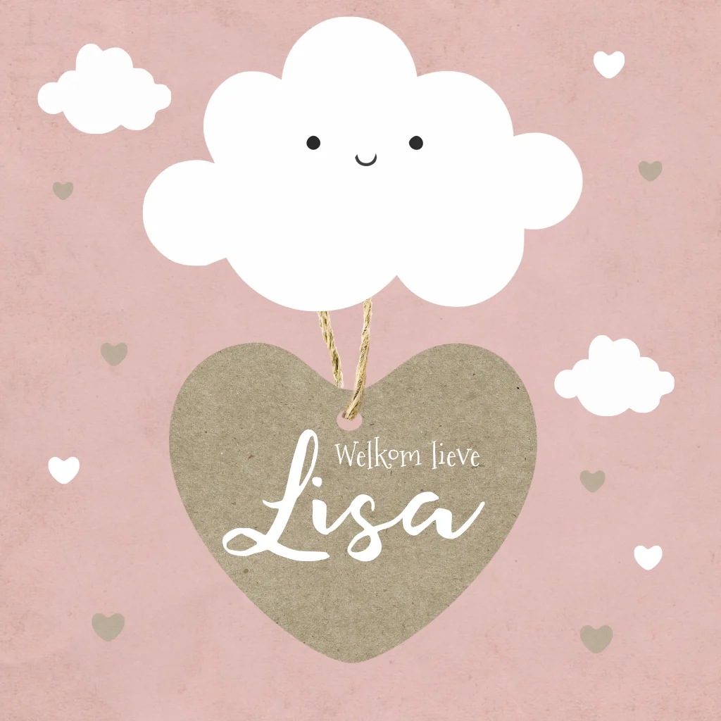 Meisjes geboortekaartje met wolkjes en hartjes regen. Hip hartjes label van kraft waarop de naam van jullie meisje staat. Het marmerlook achtergrond geeft het kaartje een vintage look. (5883)