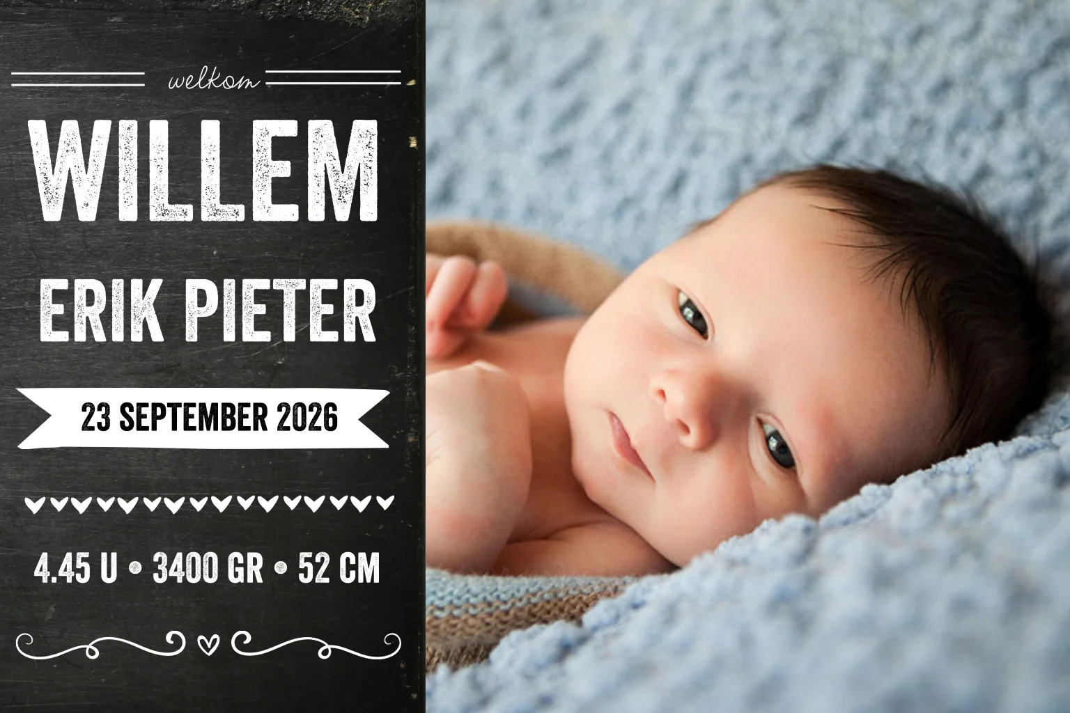 Maak deze mooie foto geboortekaart voor jullie klein jongen wondertje. Op mooie achtergrond van krijtbord. Sierlijke illustraties maken deze kaart heel feestelijk! (7239)