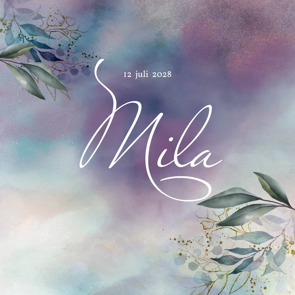 Geboortekaartje voor een meisje met paars aquarel en kleurrijke achtergrond met takjes. (20807) Geboortekaartje Mila
