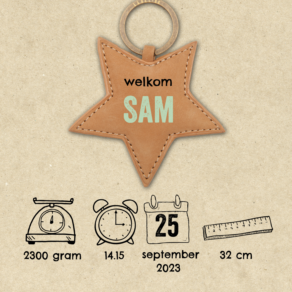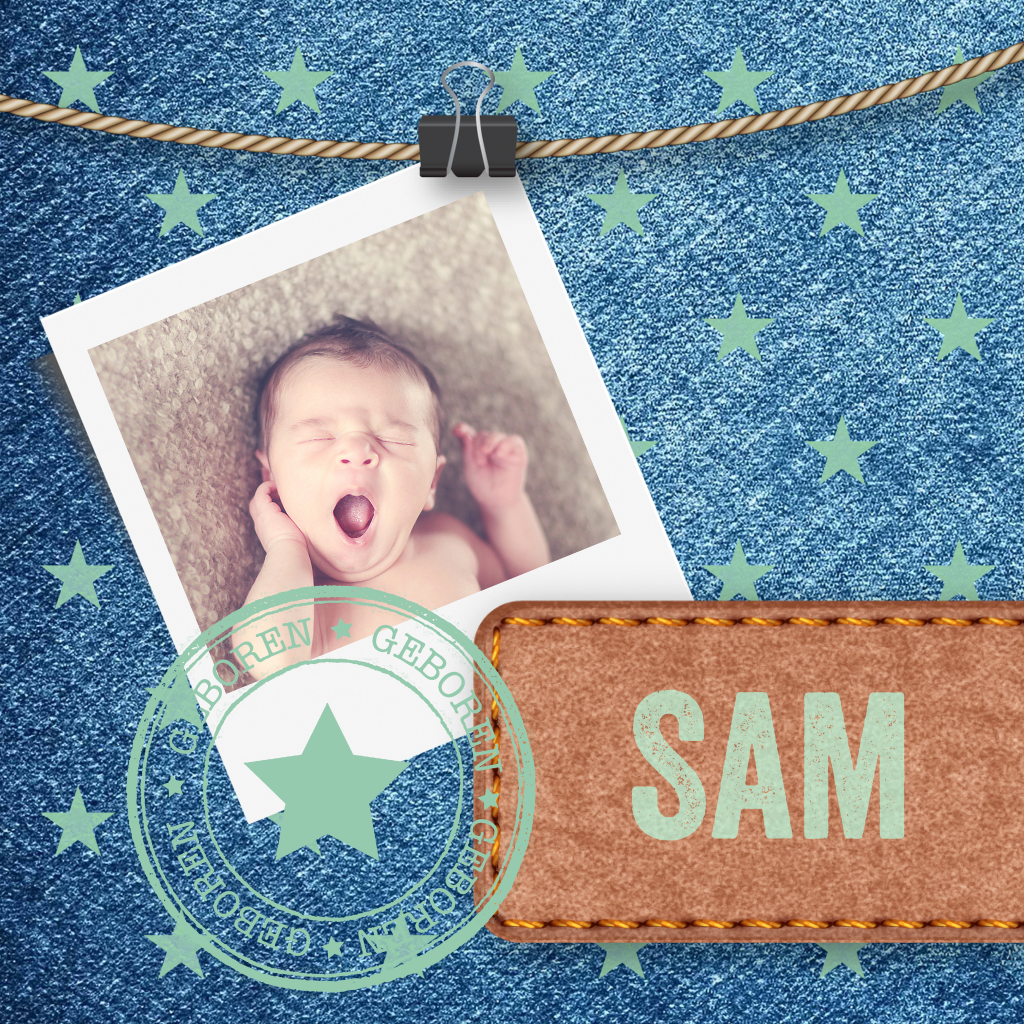 Maak deze schattige geboortekaart met spijkerstof en sterretjes en leuke polaroidfoto aan clip! (7881)