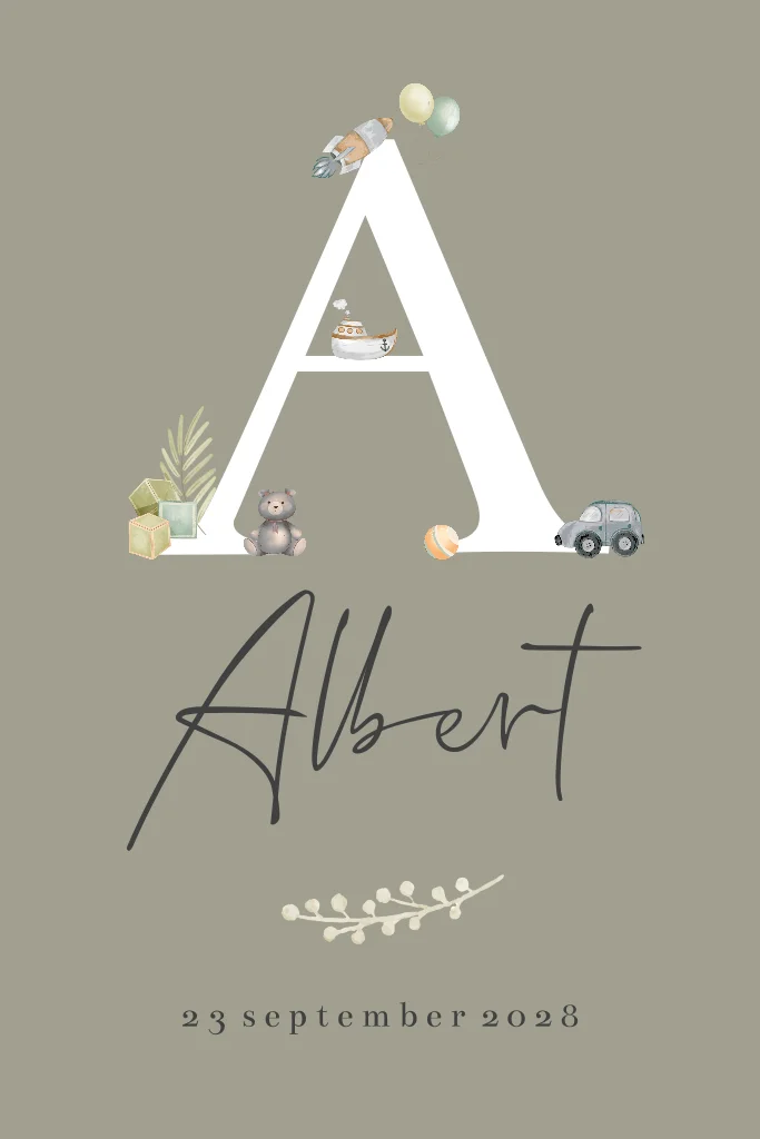 Geboortekaartje voor een meisje met een grote voorletter met daar omheen versieringen. Ruimte voor een eigen foto aan de binnenzijde van de kaart. Illustraties van blokken, vliegtuigje, boot en beer. (24201)