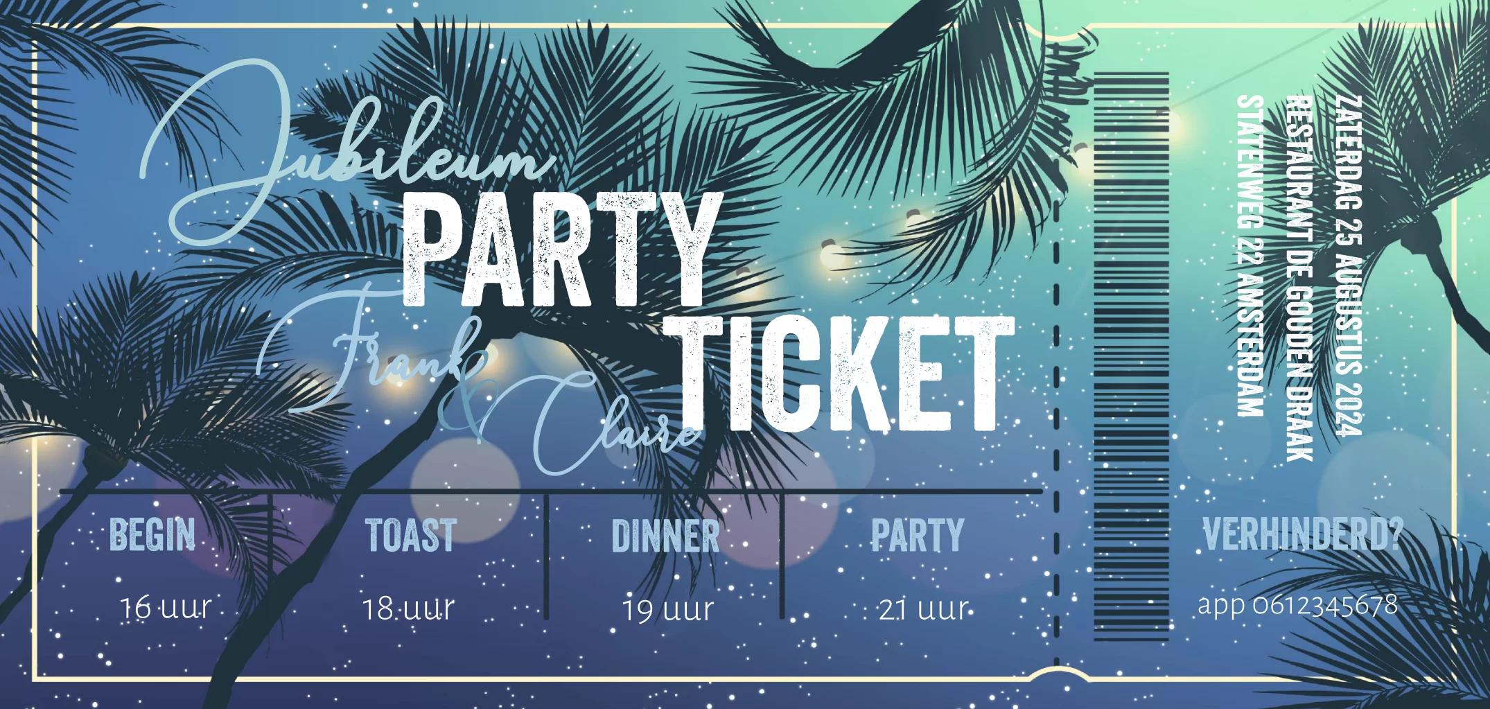 Maak deze PARTY uitnodiging met fraaie palmbomen en nodig je vrienden en familie uit met een festival jubileum ticket. (24244)