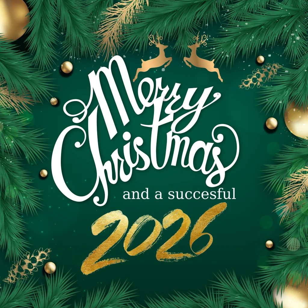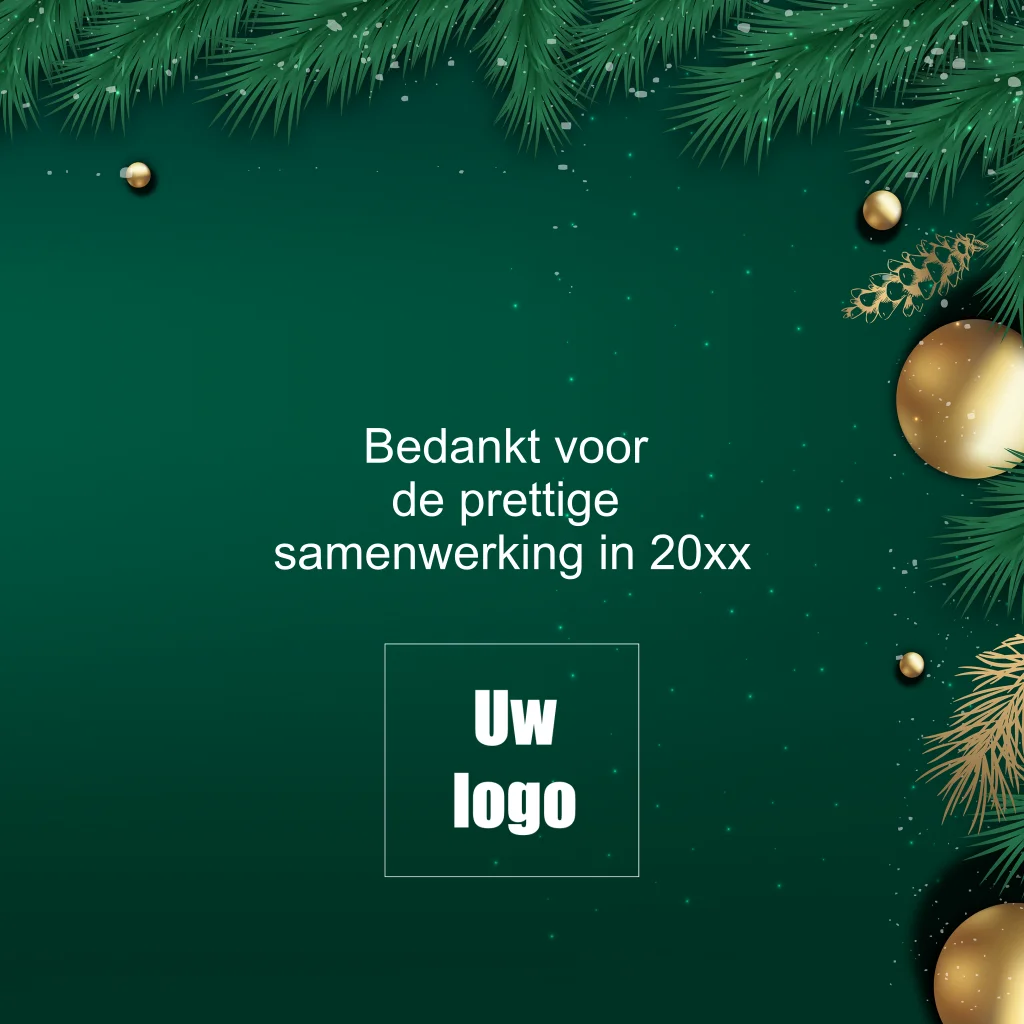 Maak deze zakelijke groene kerstkaart met gouden elementen en hulst. Fraaie gouden ballen en diepgroene kleur. (10145)