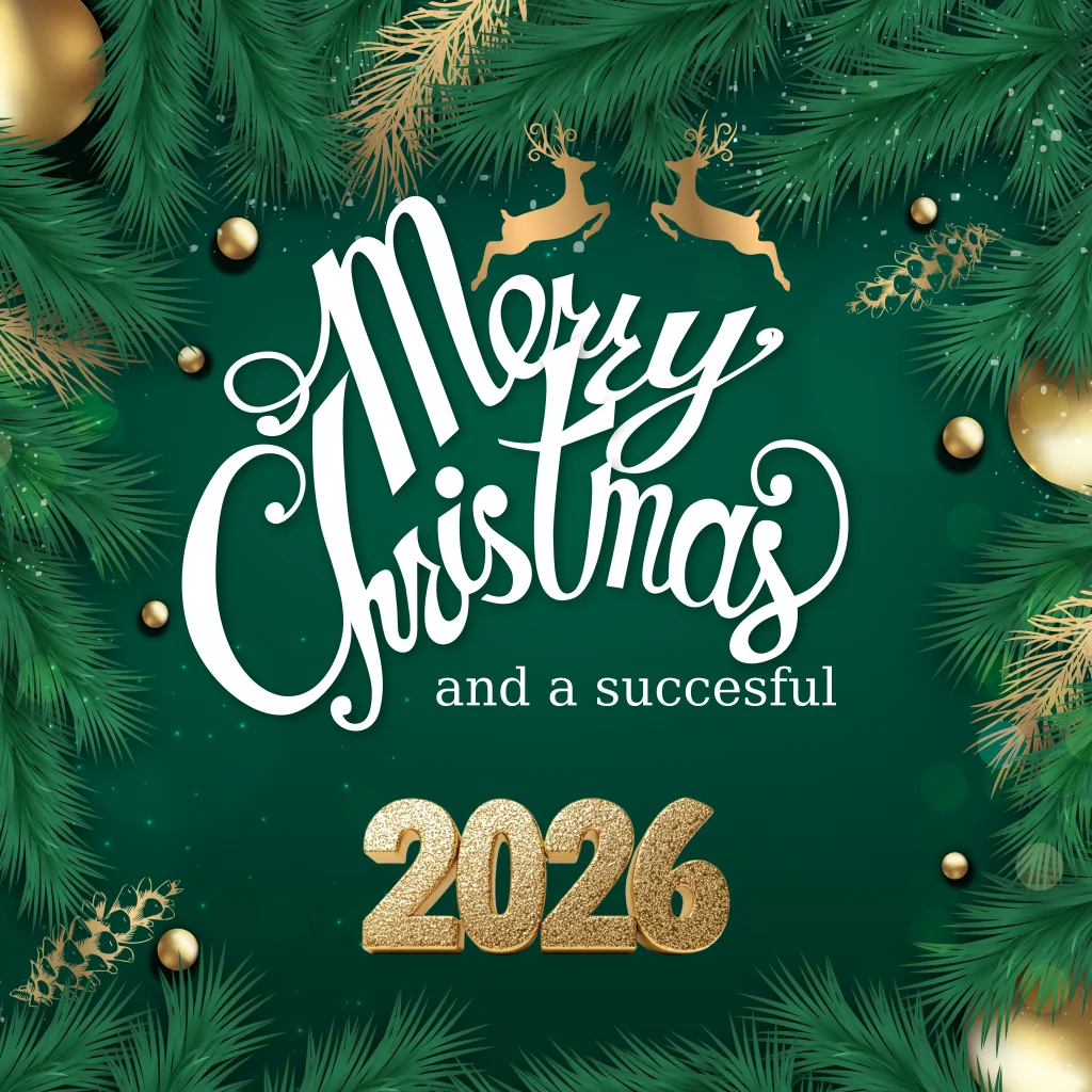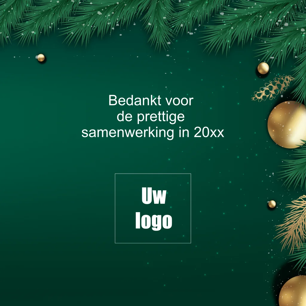 Maak deze zakelijke kerstkaart met gouden elementen en hulst. Fraaie gouden ballen en diepgroene kleur. (10147)