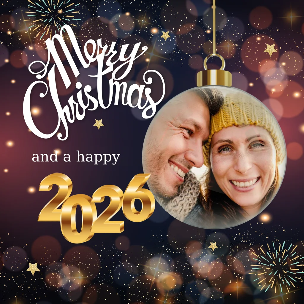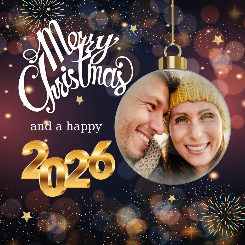 Mooie kerstkaart met goudkleurige letters en kerstbal waarin je een persoonlijke foto plaatst. (23878)