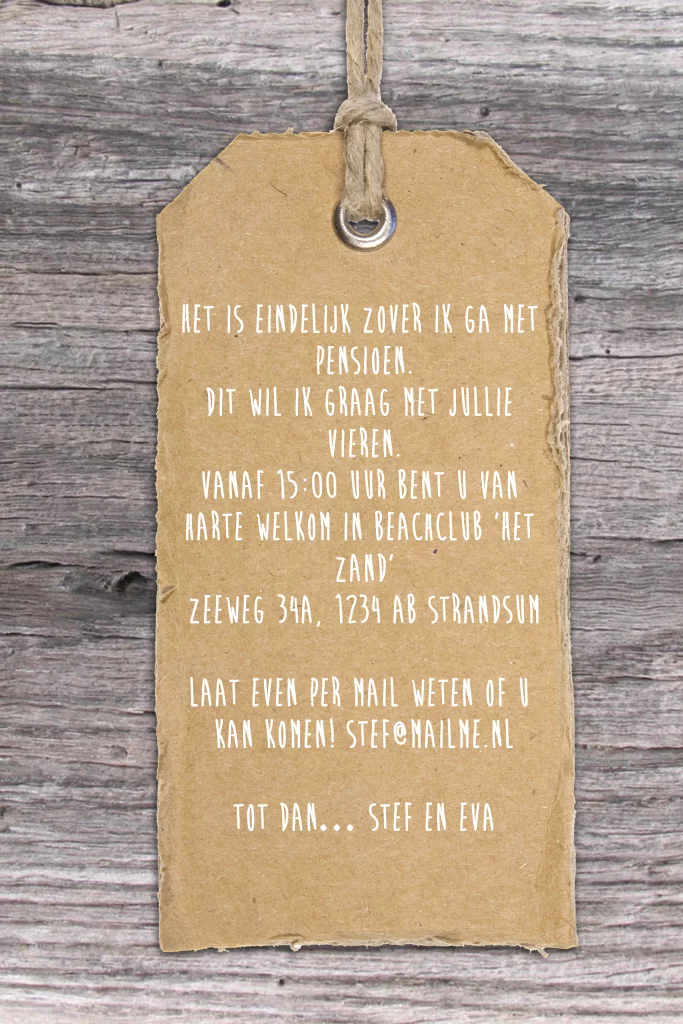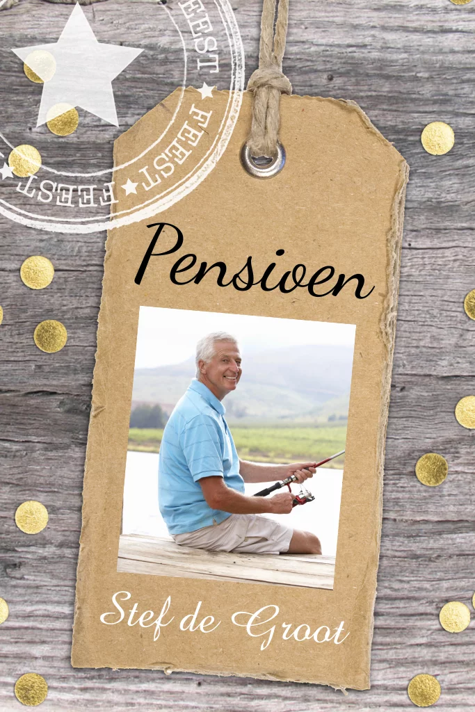 Uitnodiging pensioenfeest met hout en goudkleurige confetti. Met leuk label waarop jullie foto geplaatst wordt. (6053)