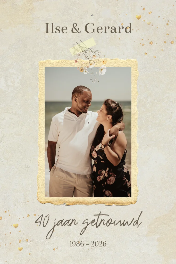Stijlvolle uitnodiging 40 jaar getrouwd met ruimte voor een eigen foto en gedroogde bloemen en gouden accenten. (24412)