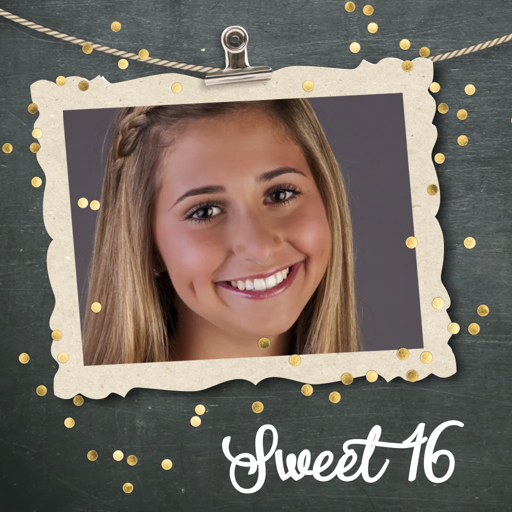 Hippe verjaardagsuitnodiging met goudkleurige confetti voor een 16e verjaardag. (6602)