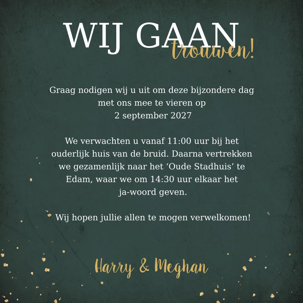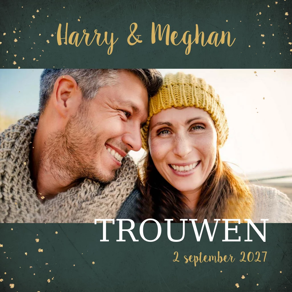 Trouwkaart donkergroen met fraaie goudlook confetti / spetters. Op voorkant staat een voorbeeld van een foto waar je een eigen portretfoto kunt plaatsen. (20292)