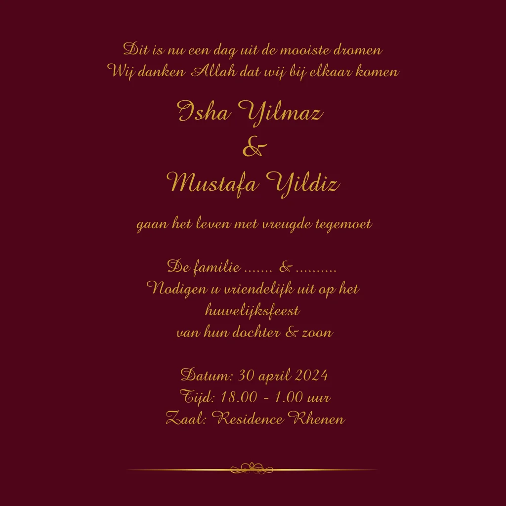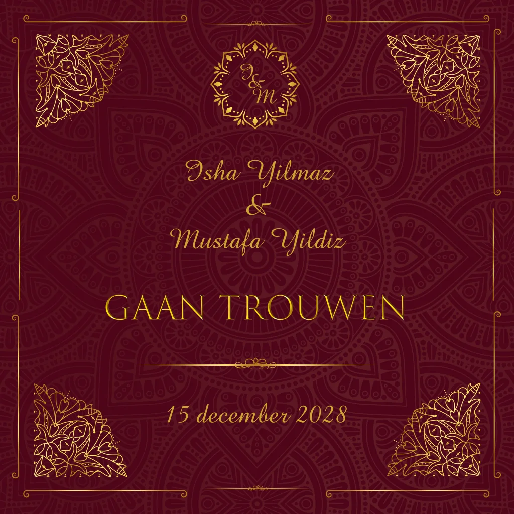 Maak deze feestelijke uitnodiging voor jullie bruiloft met feestelijke ornamenten in goud-look! Pas eenvoudig de achtergrond kleur aan naar wens!! (8251)