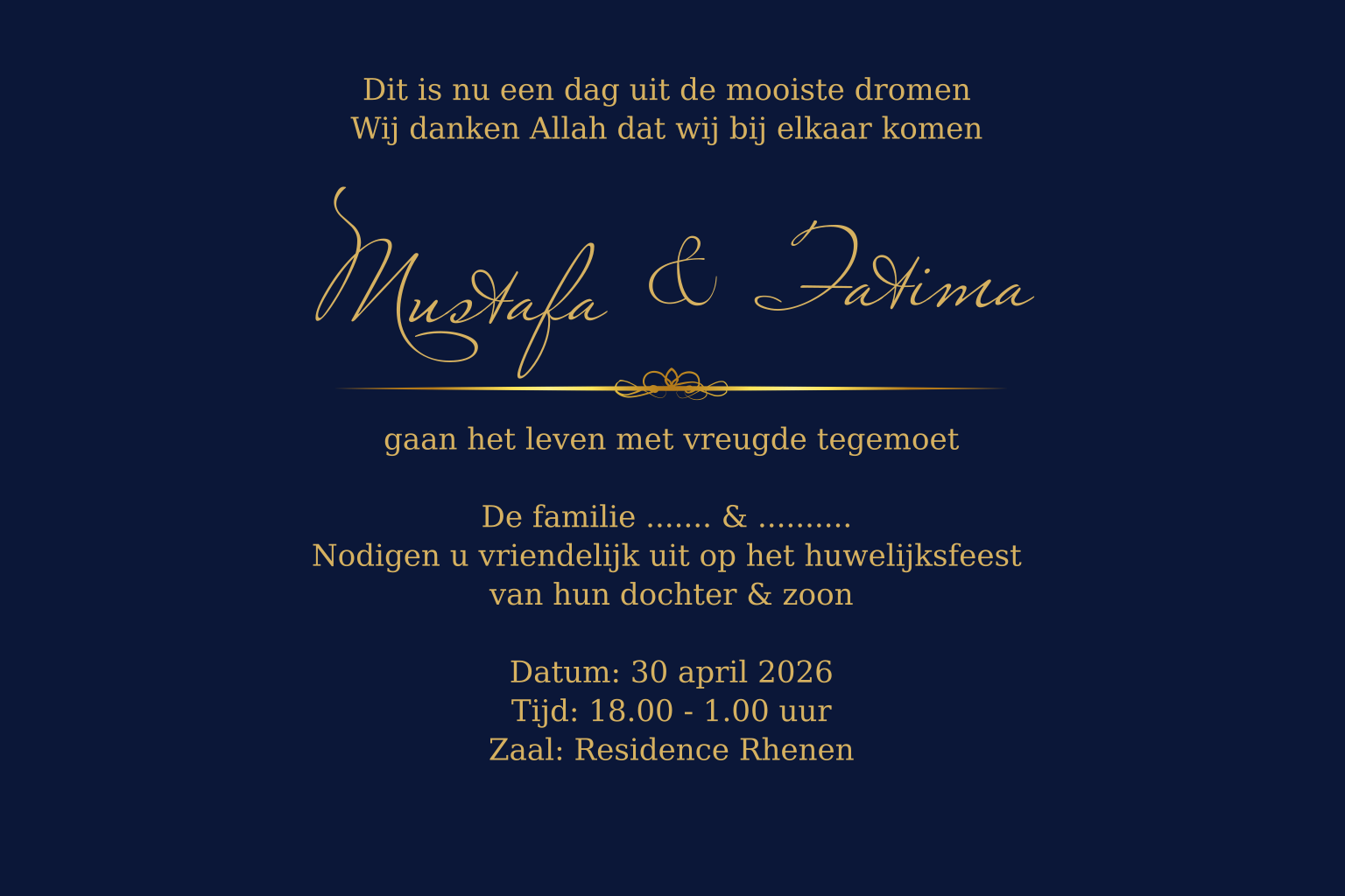 Maak deze fraaie huwelijks uitnodiging met goud-look elementen en pas eenvoudig de achtergrond kleur aan naar jullie wensen. (8245)