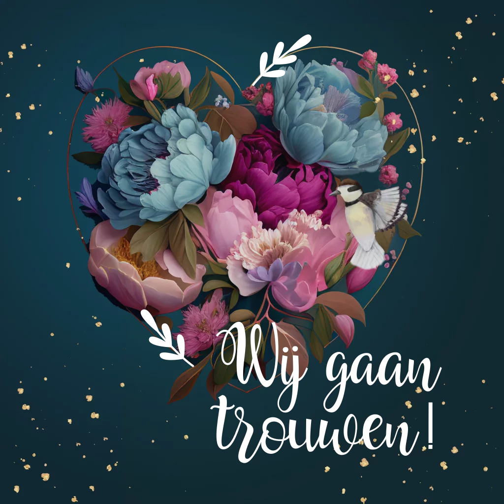 Trouwkaart met bloemen krans en hart
