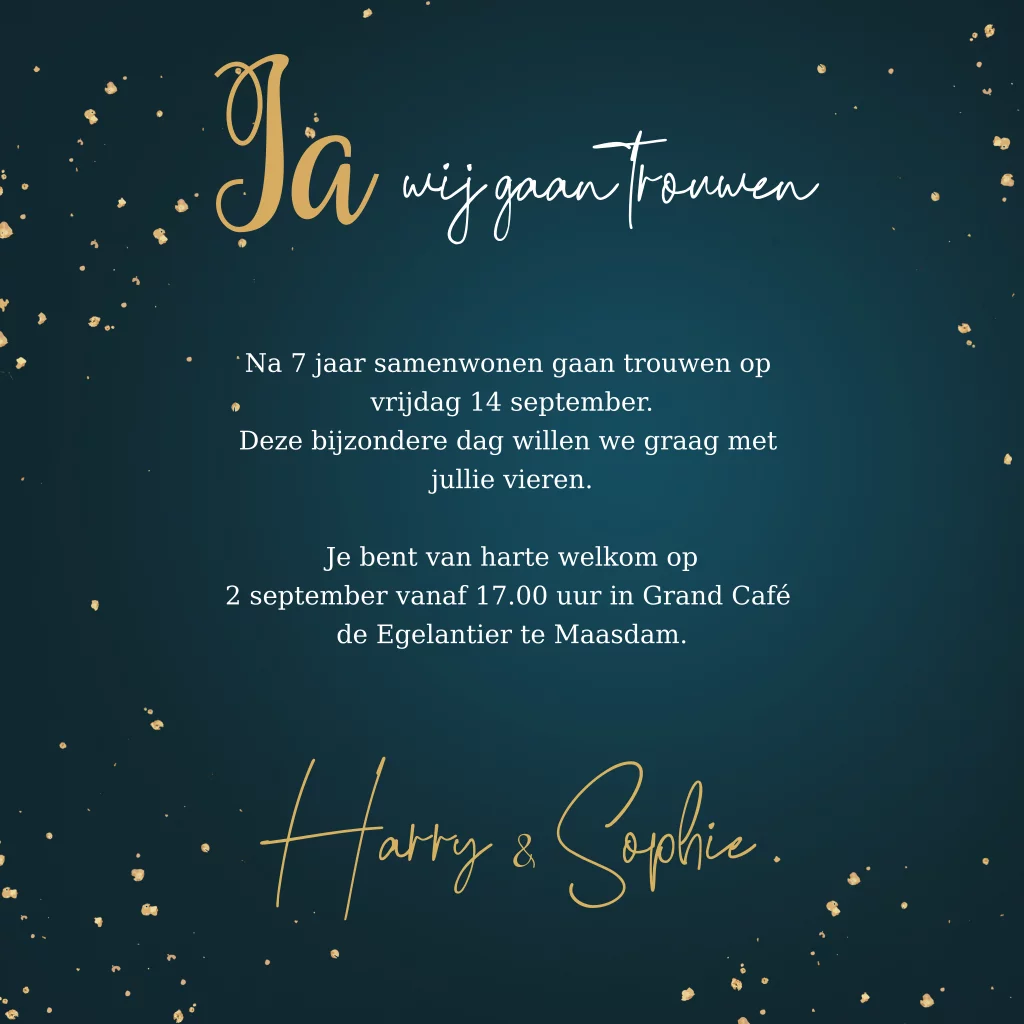 Mooie Trouwkaart met bloemenkrans in de vorm van een hart met gekleurde bloemen en mooie glimmende gouden letters. (24181)