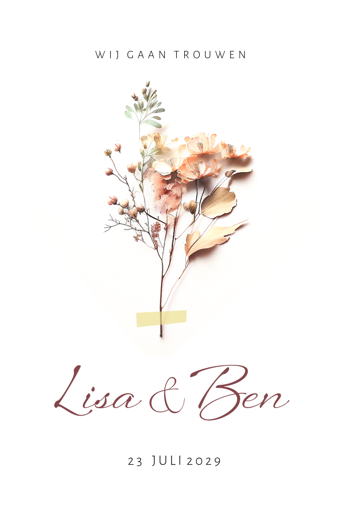 Prachtige trouwkaart met watercolor droogbloem op voorzijde. Mooi in al zijn eenvoud. (24178)