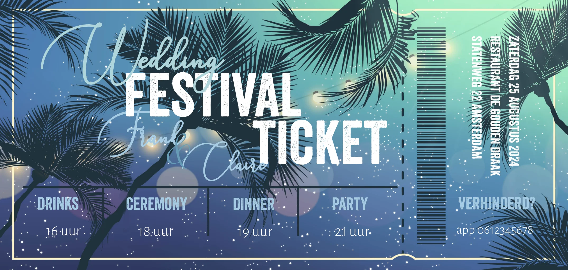 Maak deze festival uitnodiging met fraaie palmbomen en nodig je vrienden en familie uit met een festival wedding ticket. (24244)