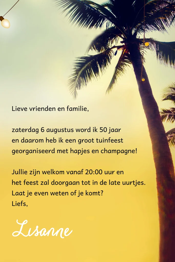 Uitnodiging feest 50 jaar met palmbomen en lichtjes.