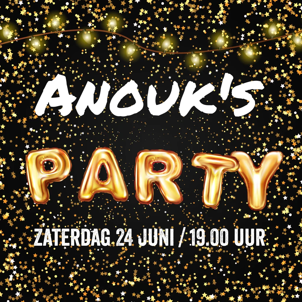Uitnodiging disco feest met ballonletters en goudlook en leuke lampjes, teksten zijn geheel aanpasbaar. (20730)
