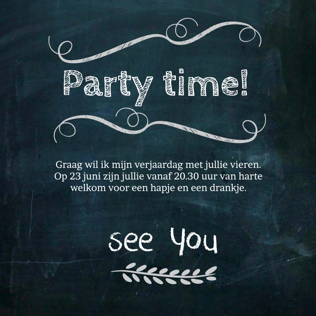 Uitnodiging feest met krijtbord teksten, teksten zijn geheel aanpasbaar. (20731)