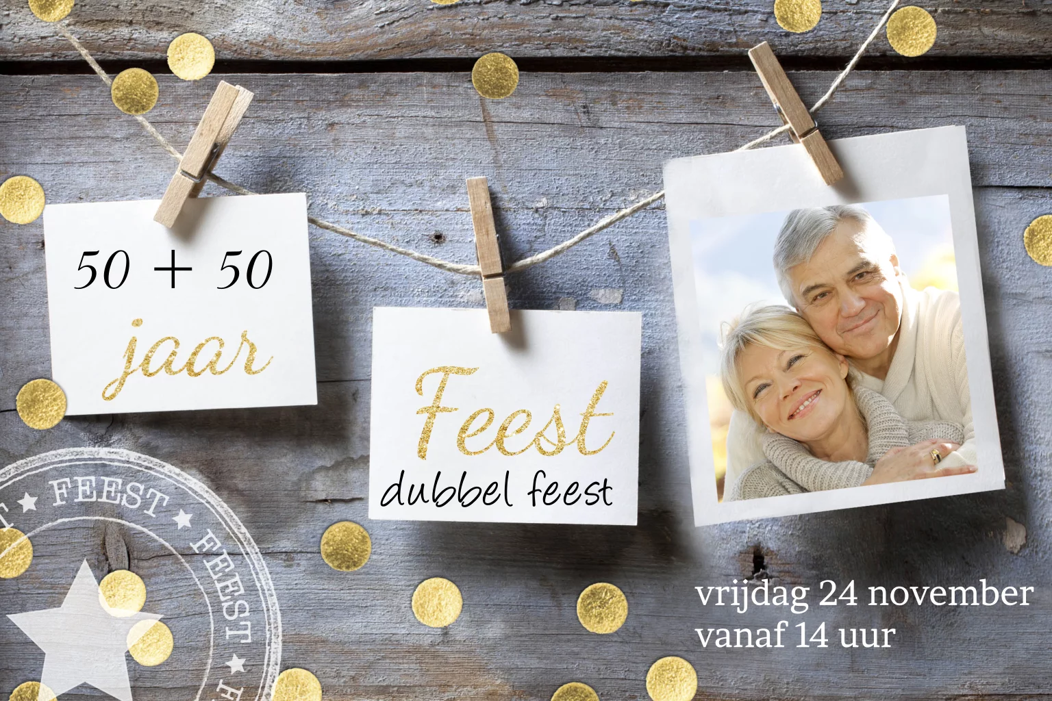 Uitnodiging dubbel feest met hout en goudkleurige confetti. (6042) Dit is een mooie uitnodigingskaart voor een feestje