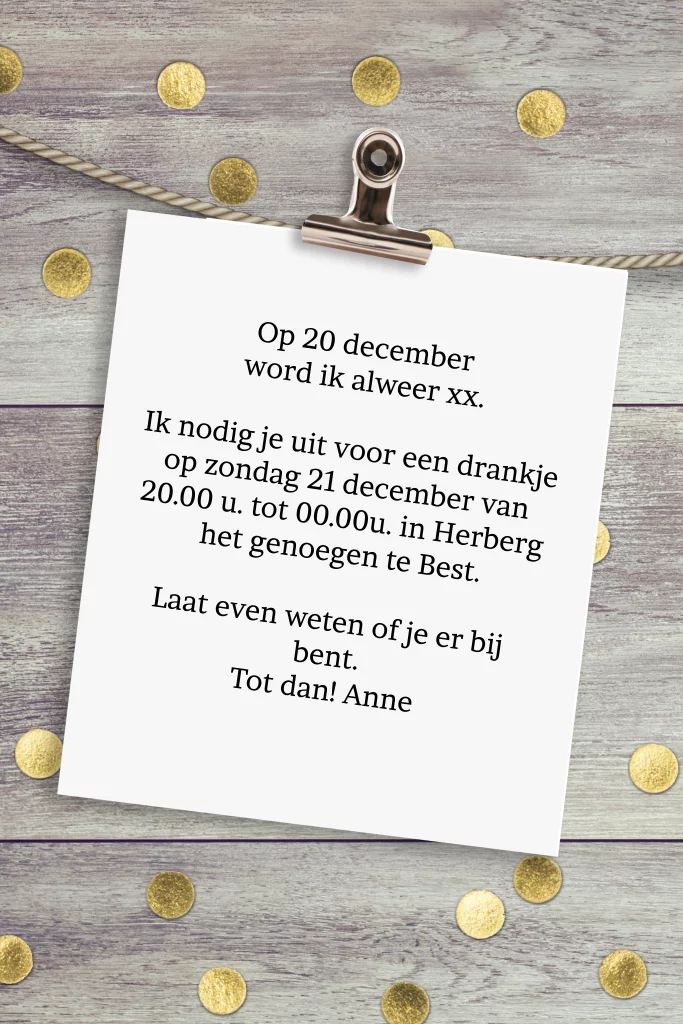 Mooie uitnodiging voor een 100e verjaardag met hippe goudkleurige confetti en leuke polaroid foto. (6192)