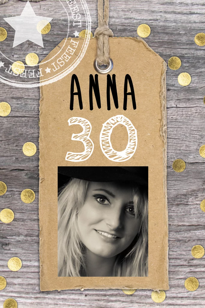 Uitnodiging 30 jaar verjaardag feest vrouw met hout en goudkleurige confetti. En hippe stempel! (5880)