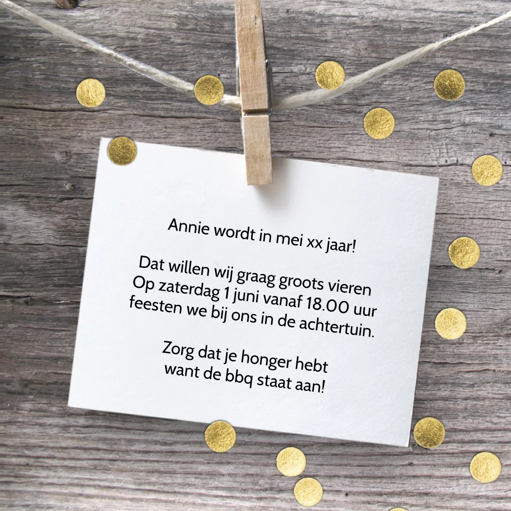 Uitnodiging 100e verjaardag feest met hout en goudkleurige confetti. Met leuke hippe stempel! (5881)
