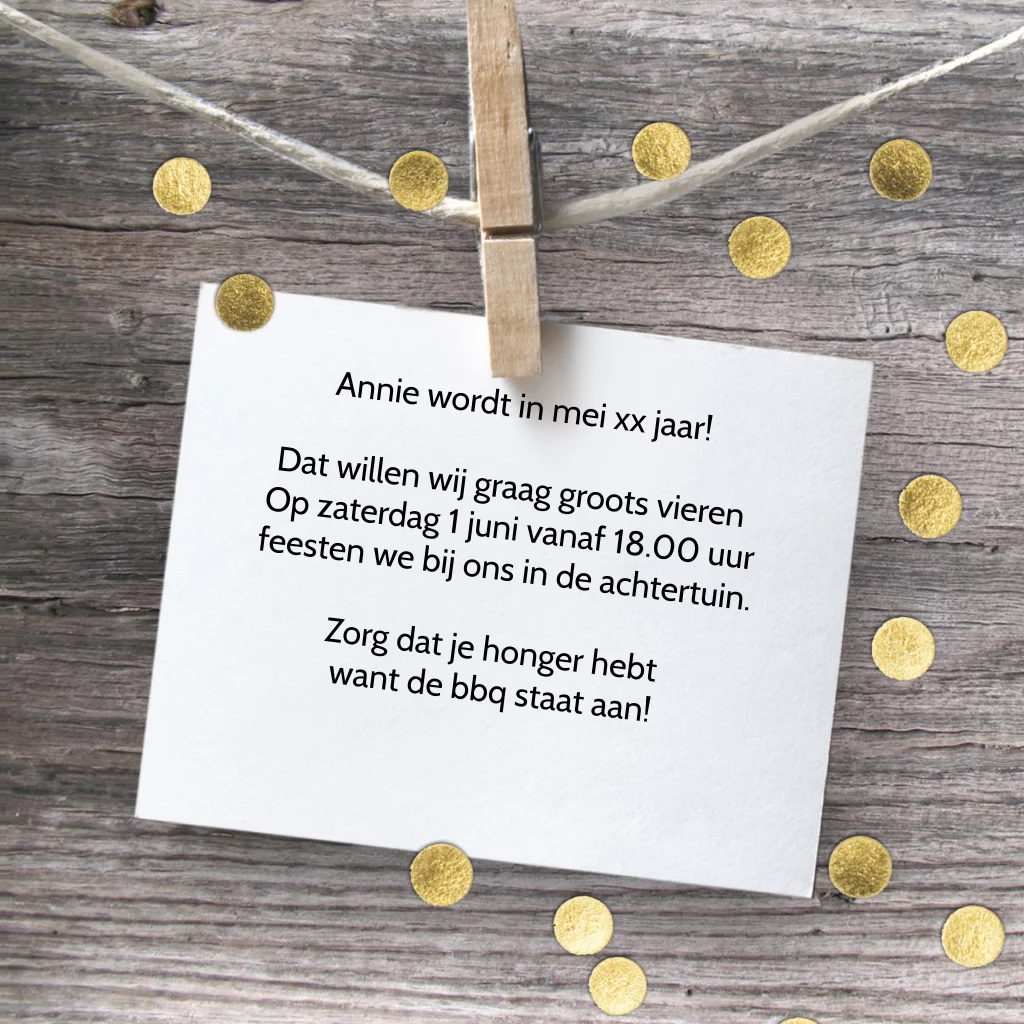 Uitnodiging 65ste verjaardag feest met hout en goudkleurige confetti. Met leuke hippe stempel! (5881)