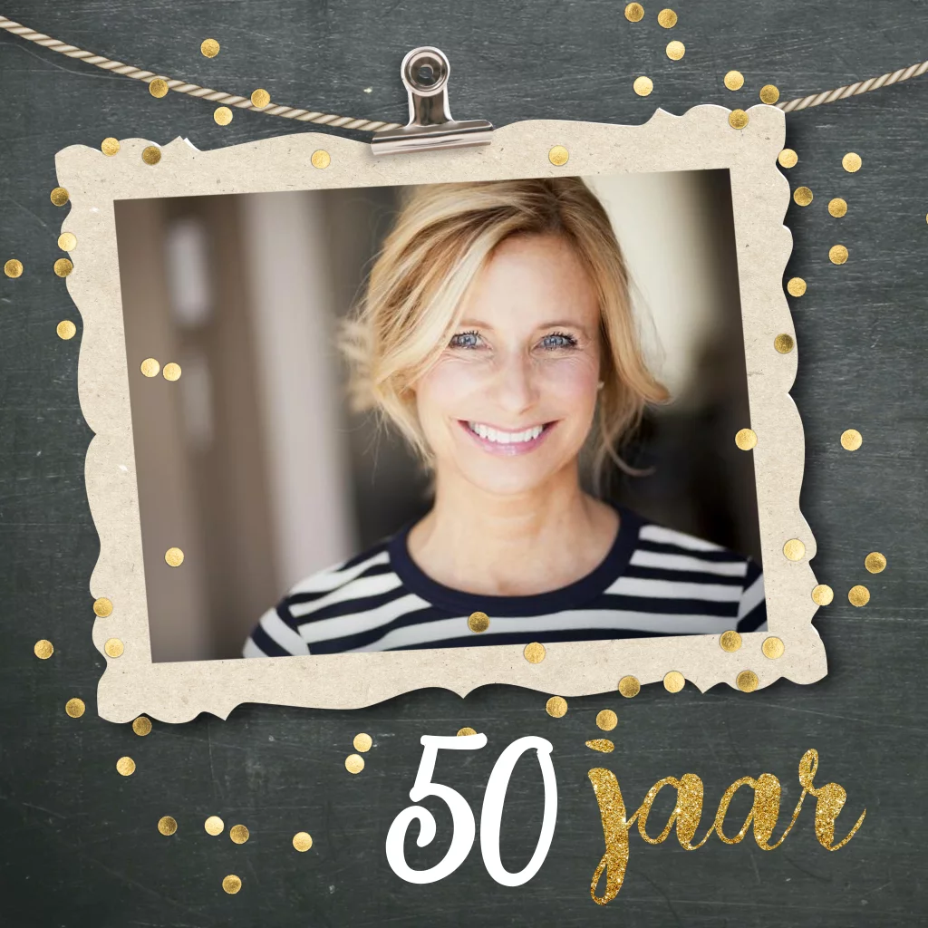 Maak deze 50 jaar verjaardag uitnodiging met goudkleurige confetti en leuke clip met daaraan jou foto! (6602)