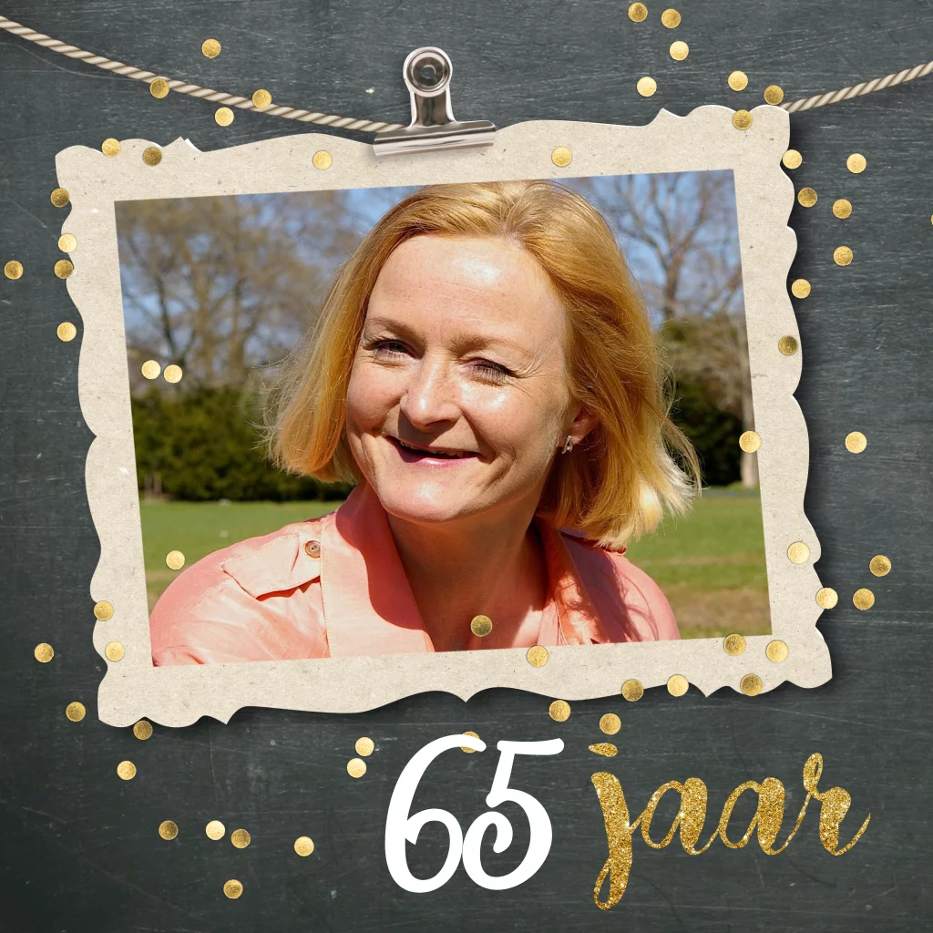 Maak deze feestelijke uitnodiging 65 jaar verjaardag met goudkleurige confetti en leuke clip met daaraan jou foto! (6602)