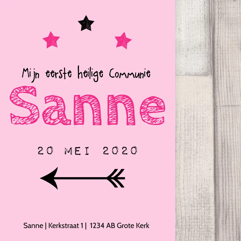Communie uitnodiging voor stoere meisjes met hout, sterren, pijlen en roze. Je kunt de tekst en kleuren helemaal naar wens aanpassen. (2947)