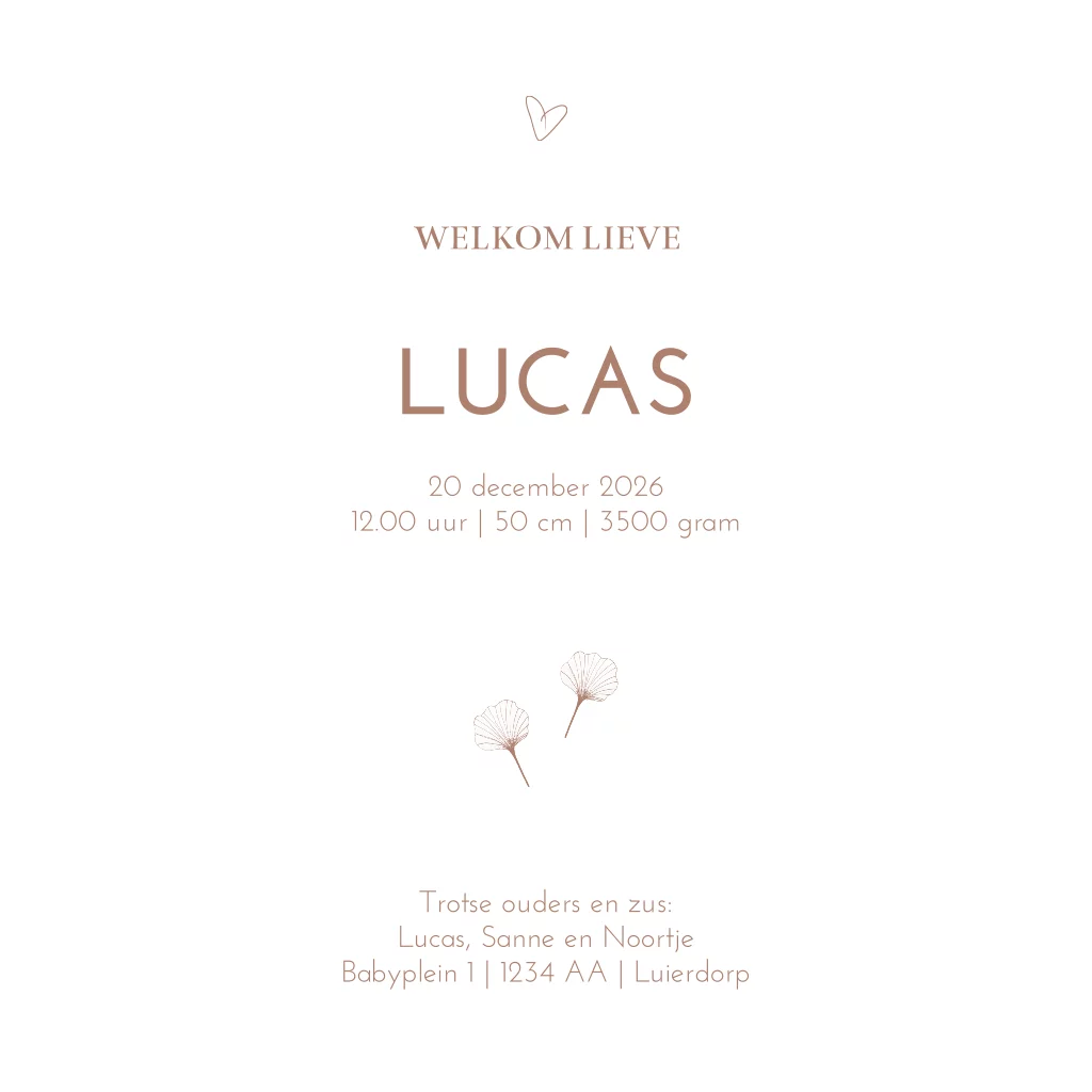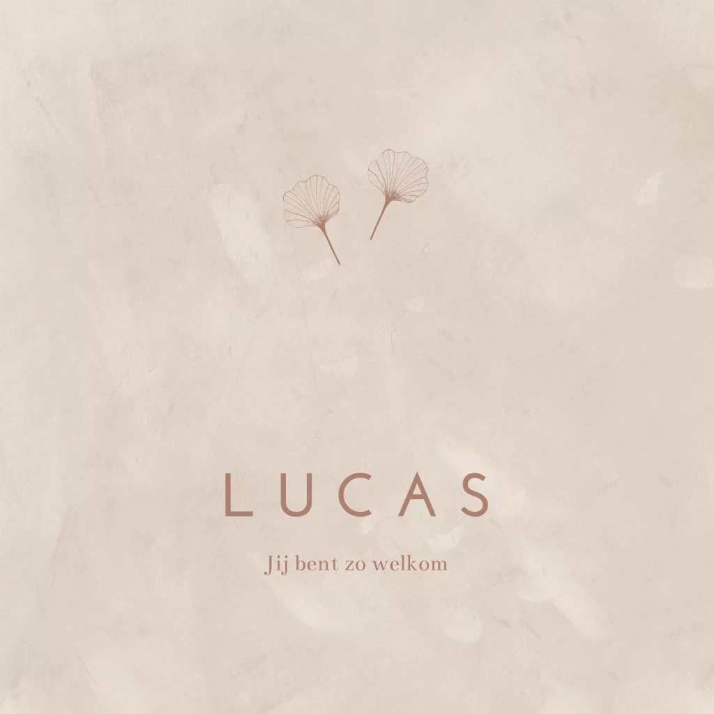 Leuk unisex geboortekaartje voor zowel de geboorte van een jongen als meisje te gebruiken met ginkgo bladeren en een trendy beige achtergrond. De kleur van de achtergrond is naar wens aan te passen.(21556)