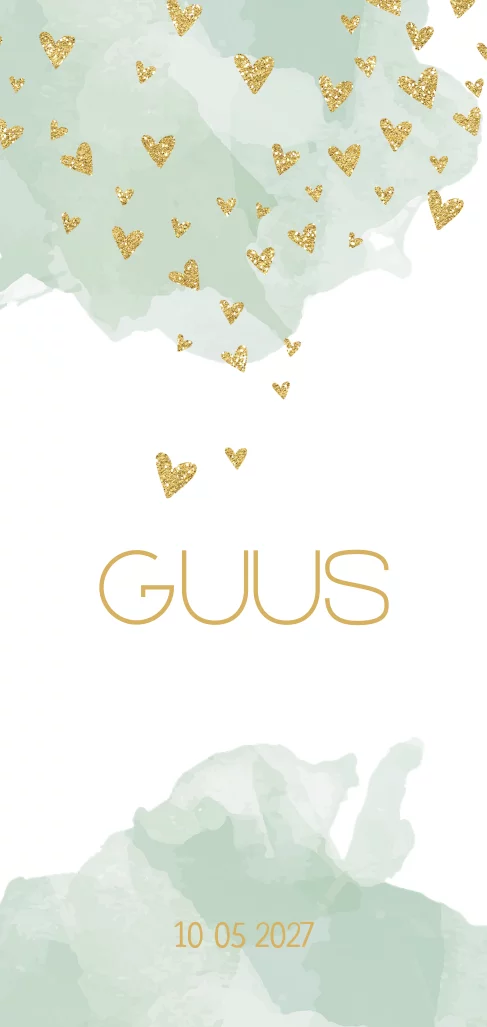 Geboortekaartje jongen groene waterverf hartjesregen goudkleurig