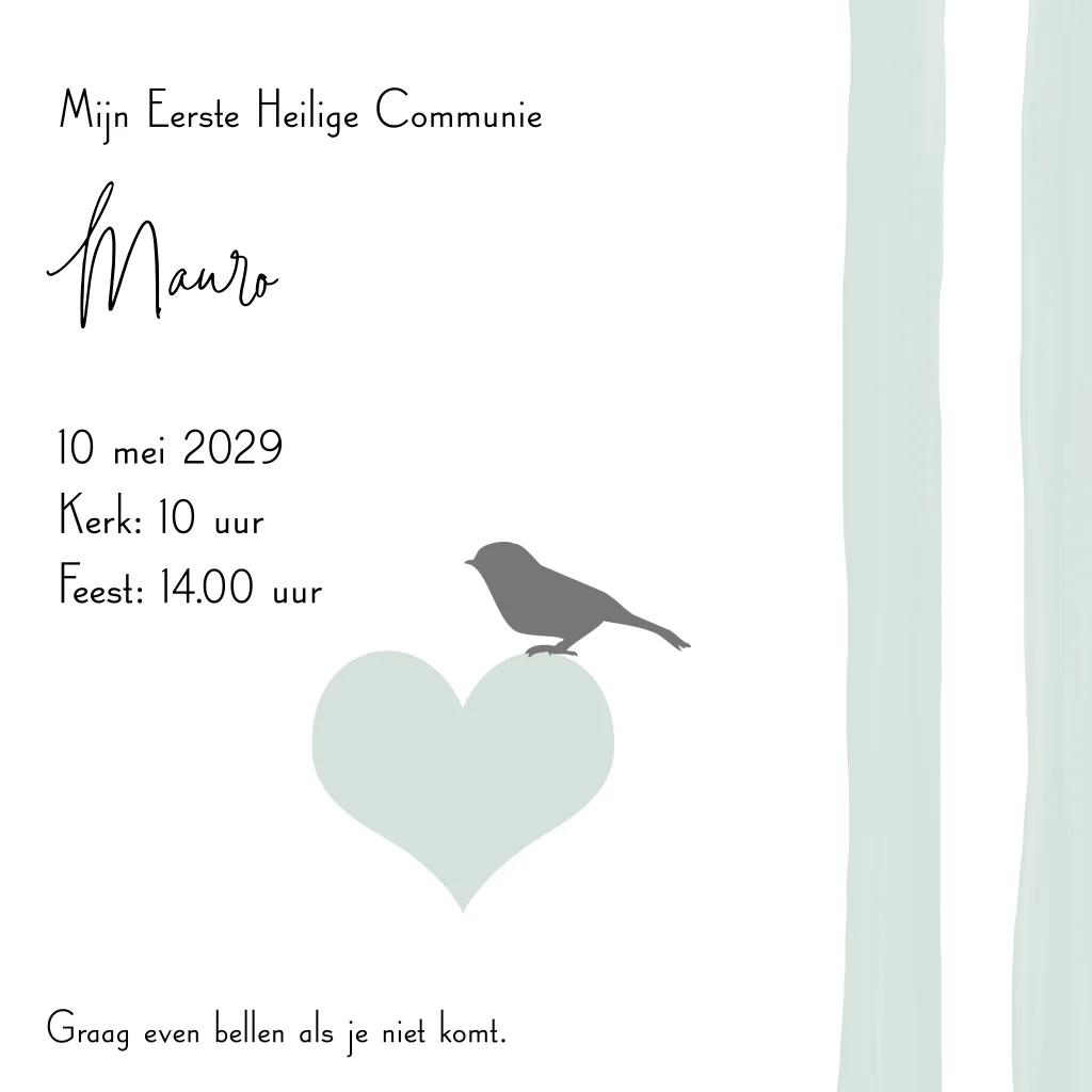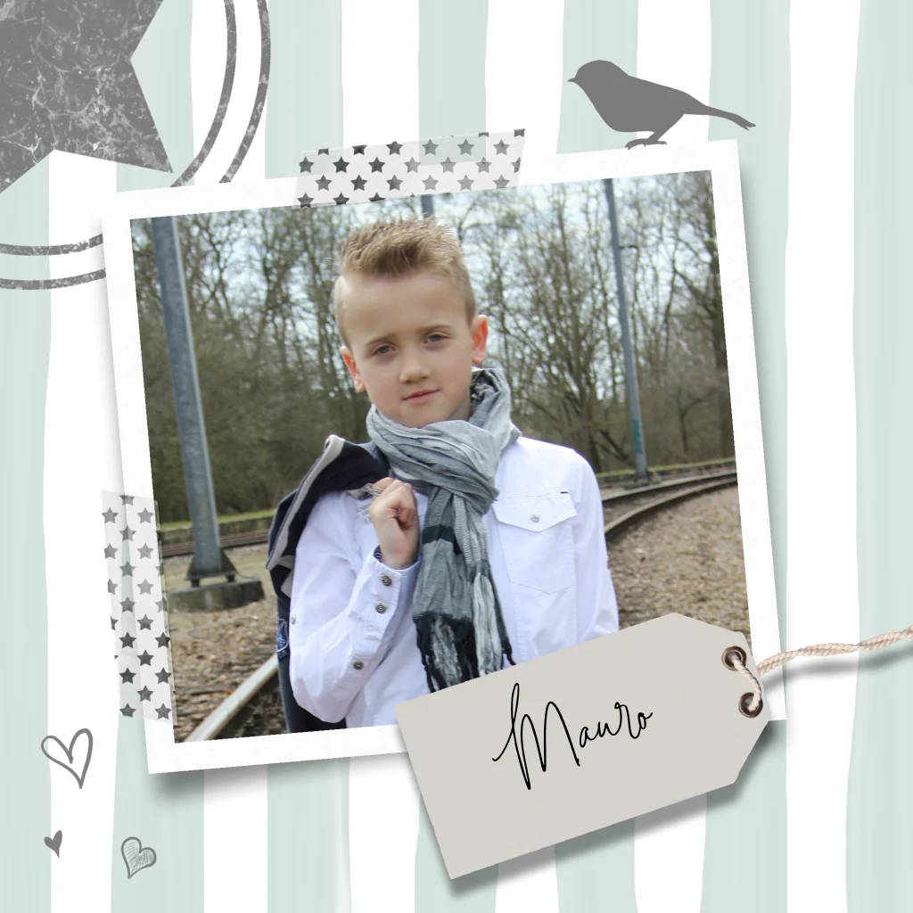 Lieve en chique communie uitnodiging voor een jongen met foto, label, vogel, stempel, hartjes, tape en groene waterverf strepen. (2942)