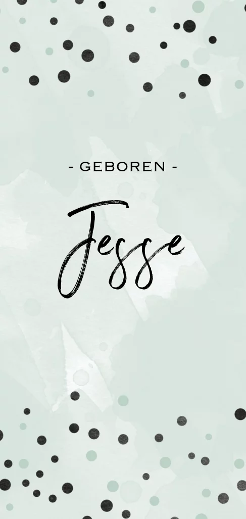 Trendy en een beetje klassiek is dit langwerpige geboortekaartje voor een jongen met achtergrond van groene aquarel en stipjes. (2925). Deze kaart is nu voorzien van ronde hoeken (meerprijs € 0,30). Wil je rechte hoeken? Zet het om bij achtergrond in de kaartenmaker.