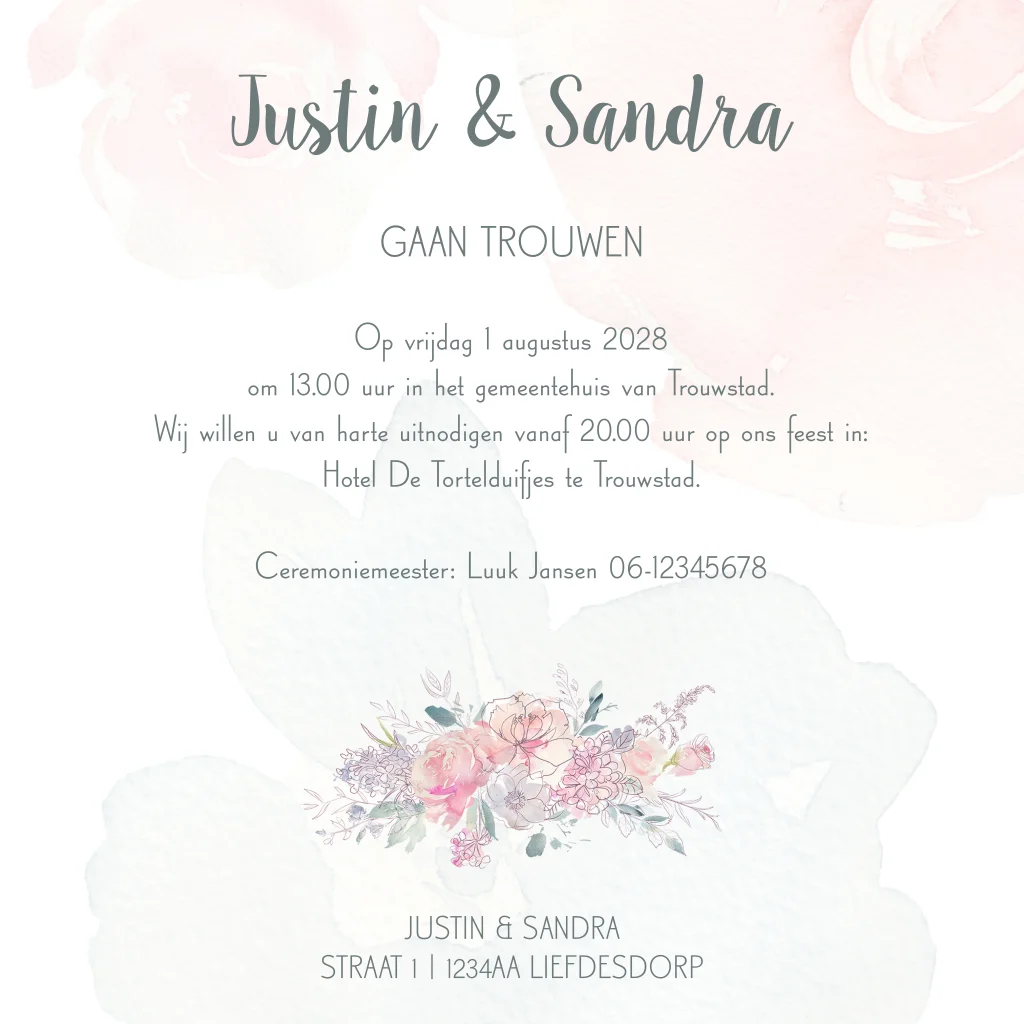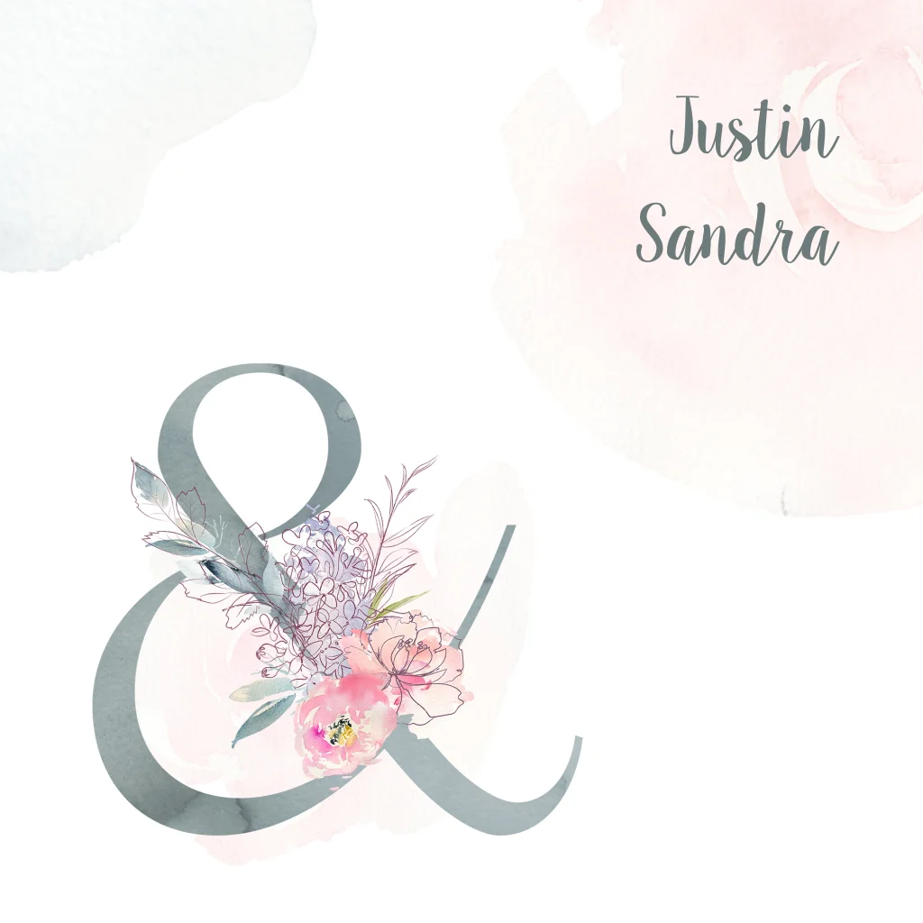 Trouwkaart met waterverf getekende bloemen in pastel kleuren roze en groen met een groot ampersand teken met bloemen. (8502)