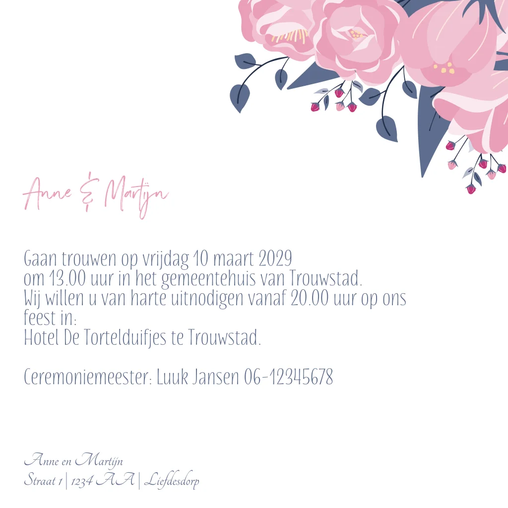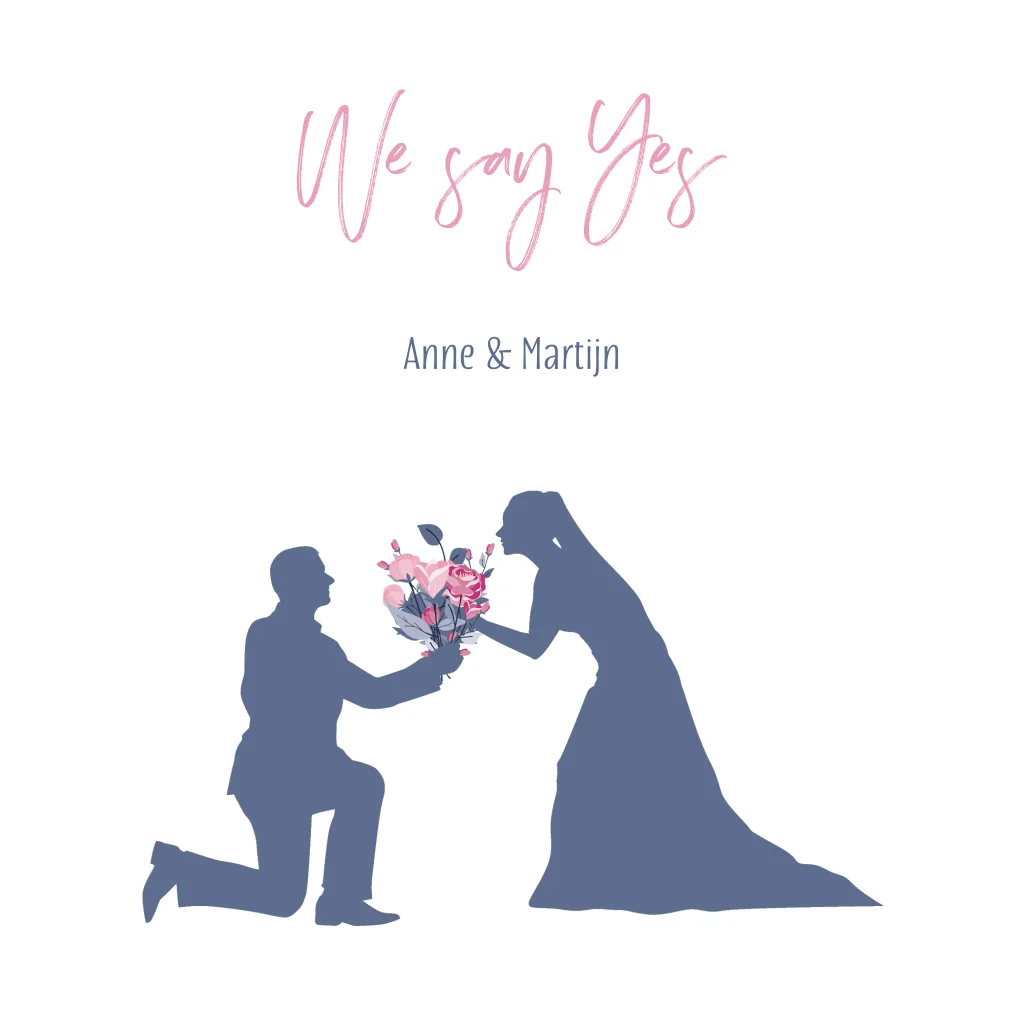 Trouwkaart met silhouet bruidspaar en bloemen in roze en lila paars kleuren. (8507)