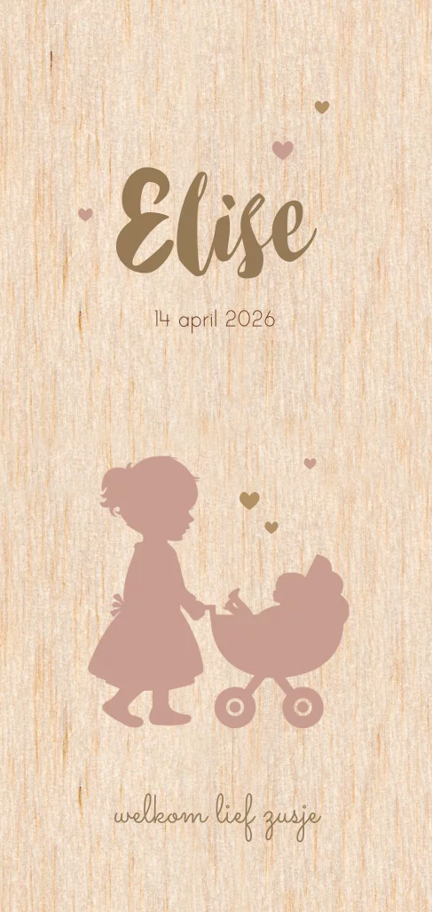 Een mooi echt houten kaartje. Daarop een silhouet van een grote zus met klein zusje. Alle teksten zijn aan te passen naar wens. (23060)